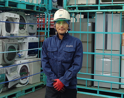 現在は家電リサイクル法に基づく「使用済み家電製品」の担当をしていて、内容としては、使用済みの家電製品を受け入れて、それを伝票と付け合わせてチェックして、所定のラックに保管し、一定量になったら処理工場へ出荷するというものです。